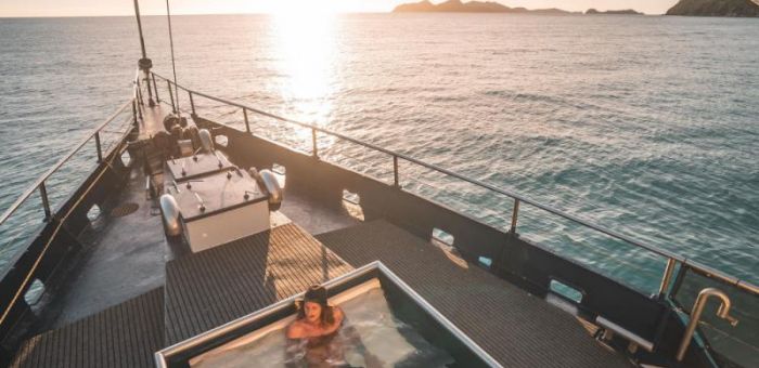 The mighty Atlantic Clipper leaves the Marina at approximately 2.30pm and after an orientation briefing the two majestic sails are hoisted and we cruise across Whitsunday Passage past the Molle group of islands along the southern end of Hook Island to Hook Passage which is sandwiched between the two largest islands out of the 74 that make up the Whitsundays. Once at the overnight anchorage there is plenty of time to enjoy a swim in the clear, Sunkist, tropical waters. The Clipper’s 12 person hot spa is in full swing but as the day moves into the twilight hours it’s time to enjoy a cold beverage and marvel at the mesmerising sun setting over the islands with its fierce orange glaze, emanating crimson rays reflecting off the tranquil crystal clear ocean. As the day moves through to night it is time to enjoy a beautiful freshly prepared meal and relax with a few evening drinks up on the spacious top deck. The evening consists of relaxation, chat, games and on most trips Dolphins come to hunt and play under our two huge fish spotlights. These majestic creatures are like unpaid crew members as they entertain everyone on board and normally stay beside the boat all night as they playfully chase other marine life as well as each other literally only a few feet from the euphoric passengers. There is also other marine life that is attracted to this fish light such as giant trevally, and other pelagic fish as well as white and black tip reef sharks. All this is enjoyed under a dazzling blanket of stars unspoilt by the white pollution of towns and cities on land.